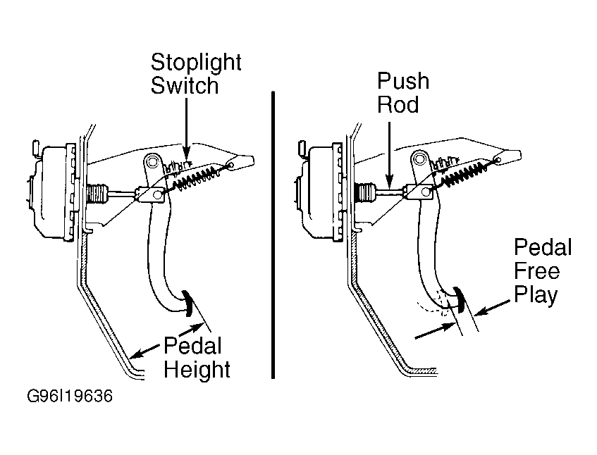 Stoplight switch is located above brake pedal. See Figure. Before adjusting stoplight switch, ensure brake pedal height is correct. See BRAKE PEDAL HEIGHT . Disconnect stoplight switch connector. Loosen stoplight switch lock nuts. Turn stoplight switch in until it lightly contacts pedal stopper. Turn stoplight switch out one turn. Clearance between stoplight switch nose and pedal stopper should be .02-.09" (0.5-2.4 mm). Tighten lock nut. Check brakelight operation.