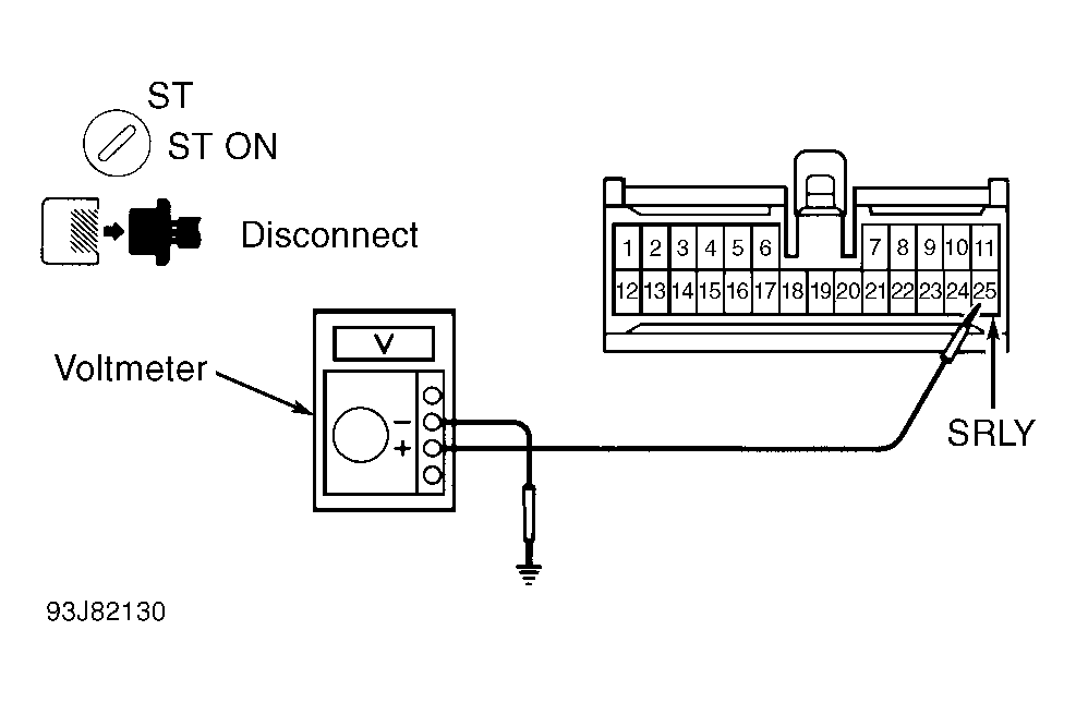 - While holding ignition switch in START position, measure voltage between body ground and terminal SRLY of theft deterrent ECU connector (harness side). See Fig 1. If 10-14 volts is measured, replace theft deterrent ECU. If 10-14 volts is not measured, check for faulty starter relay, park/neutral position switch (clutch switch on M/T), or wiring harness.