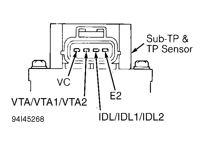 Disconnect sub-TP sensor connector. Measure resistance across specified terminals of sub-TP sensor connector. See SUB-TP SENSOR RESISTANCE table. See Fig 1. If resistance is not as specified , adjust sub-TP sensor. See SUB-THROTTLE POSITION (SUB-TP) SENSOR under MISCELLANEOUS CONTROLS in appropriate ADJUSTMENTS article.