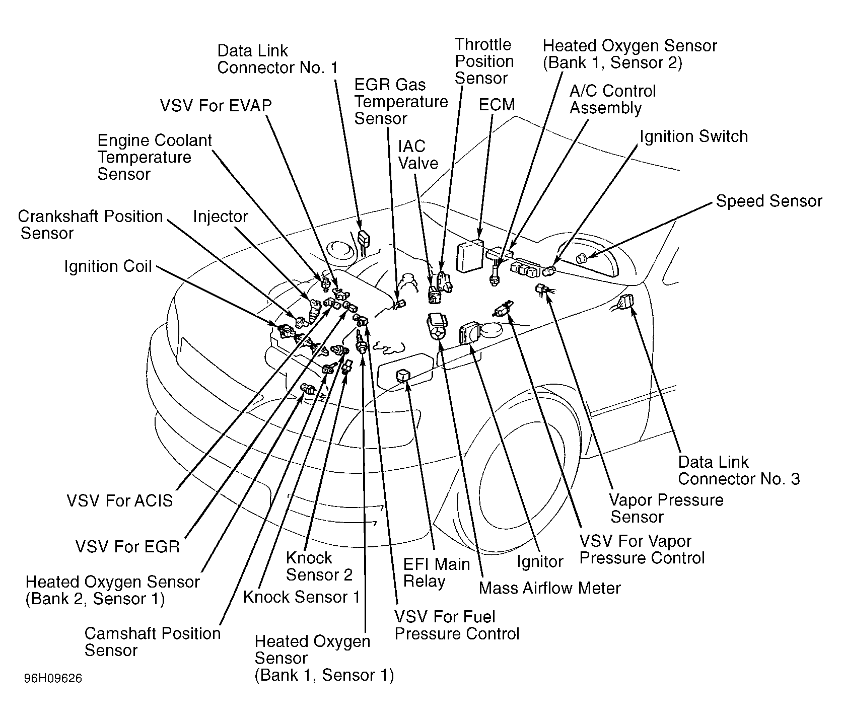 ECM controls engine operation based on input signals from various sensors. See Fig 1 ECM also controls transmission. If self-diagnostic system detects a fault, it stores a trouble code in the ECM memory, and turns on the Malfunction Indicator Light (MIL), also known as CHECK ENGINE light. For more information, see appropriate SELF-DIAGNOSTICS article.