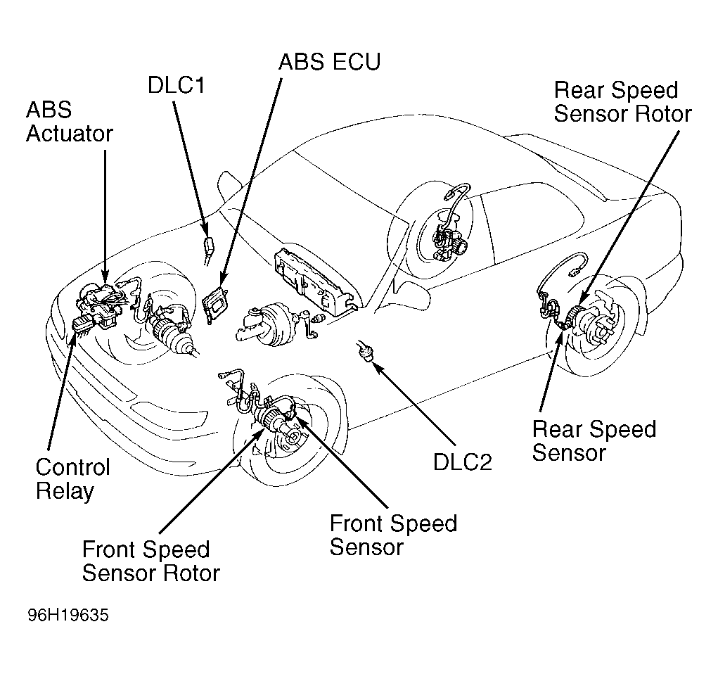 Anti-Lock Brake System (ABS) controls brake fluid pressures to each individual front brake caliper and rear brake calipers during a panic stop to prevent wheel lock-up. System consists of actuator, solenoid relay, pump motor relay, Electronic Control Unit (ECU), and a speed sensor at each wheel. If a system fault occurs, the ECU stores a self-diagnostic code(s) that can be retrieved to diagnose malfunction. See Fig 1.