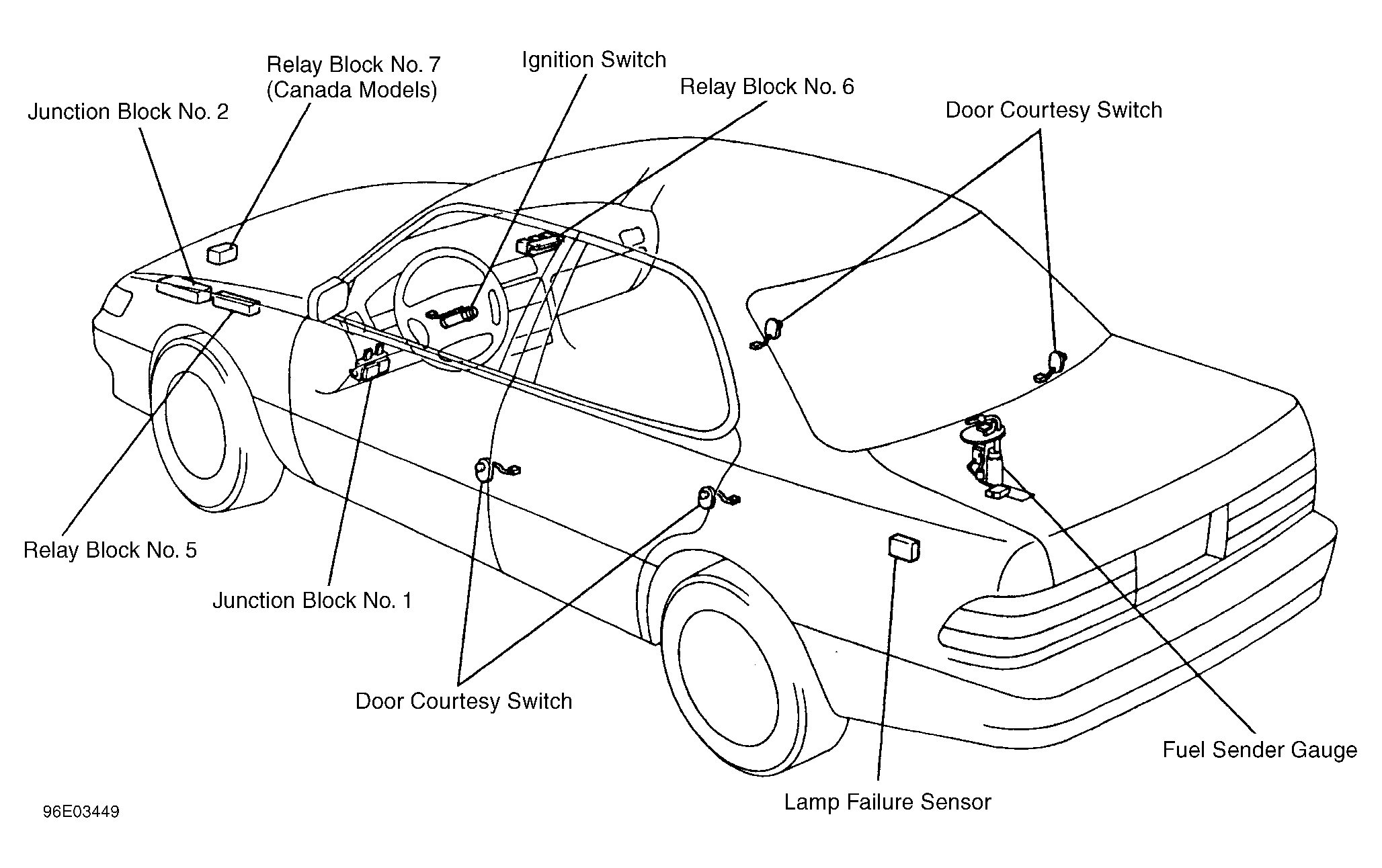 | Relay Block No. 7 (Canada Models) | On left front of engine compartment, behind left front headlamp. See Figure. |