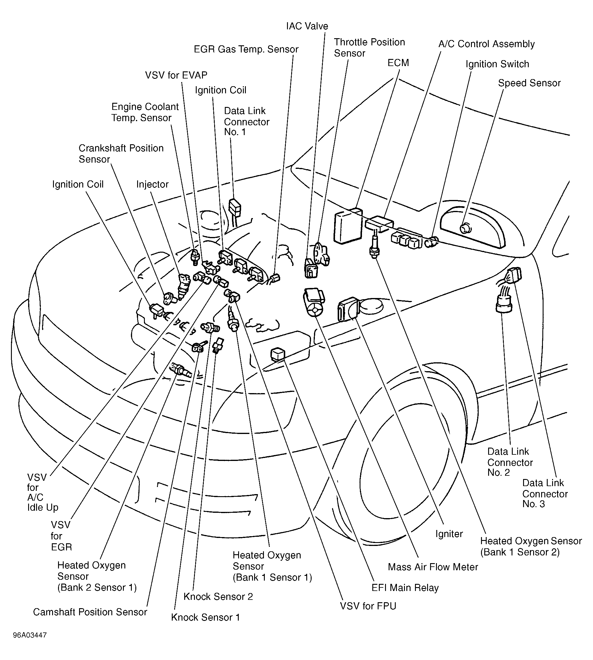 | Engine Control Module (ECM) (View 1) | Behind right side of dash. See Figure. |