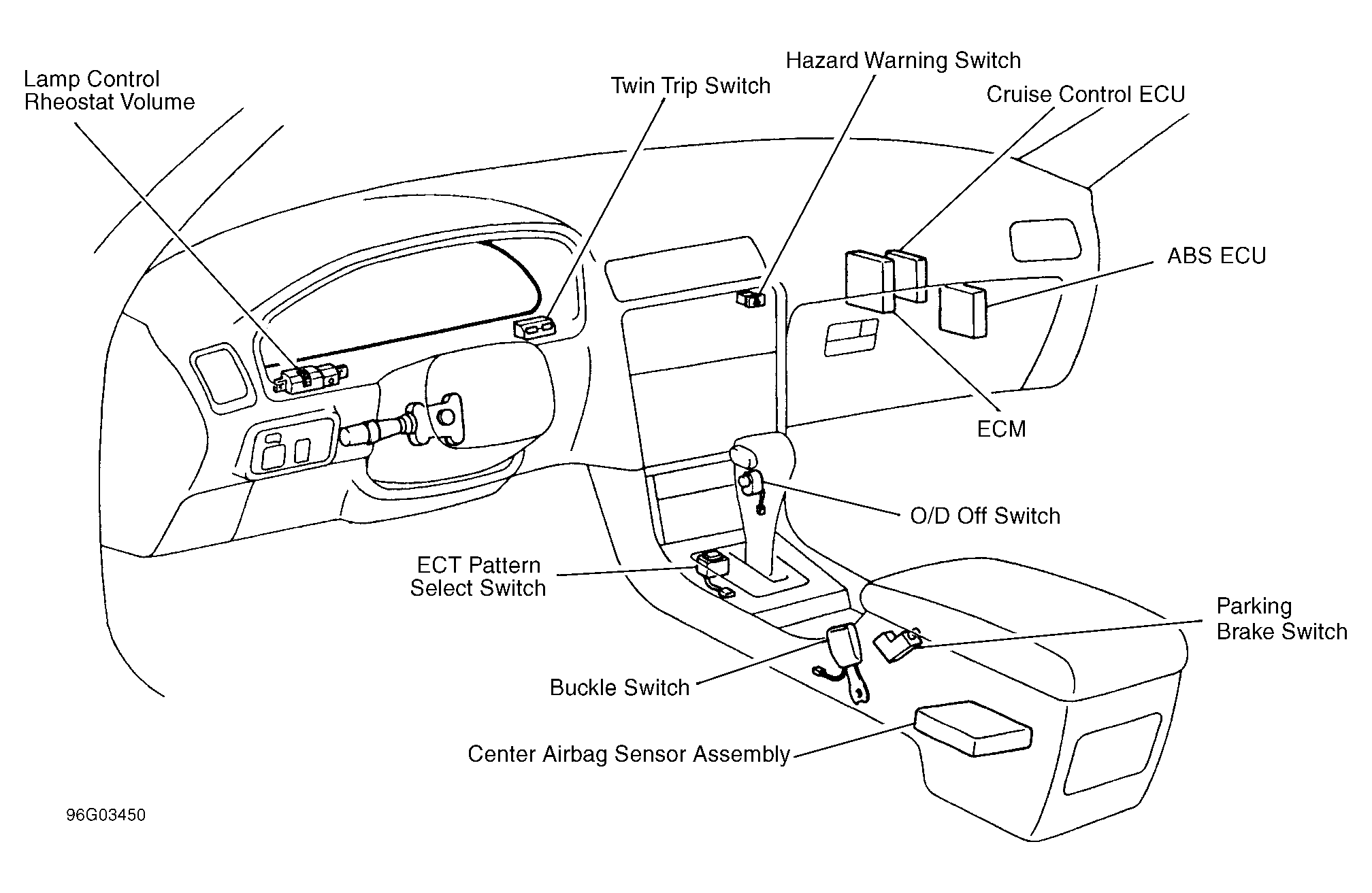 | Shift Lock ECU (A/T) | Under center console, behind shifter. |