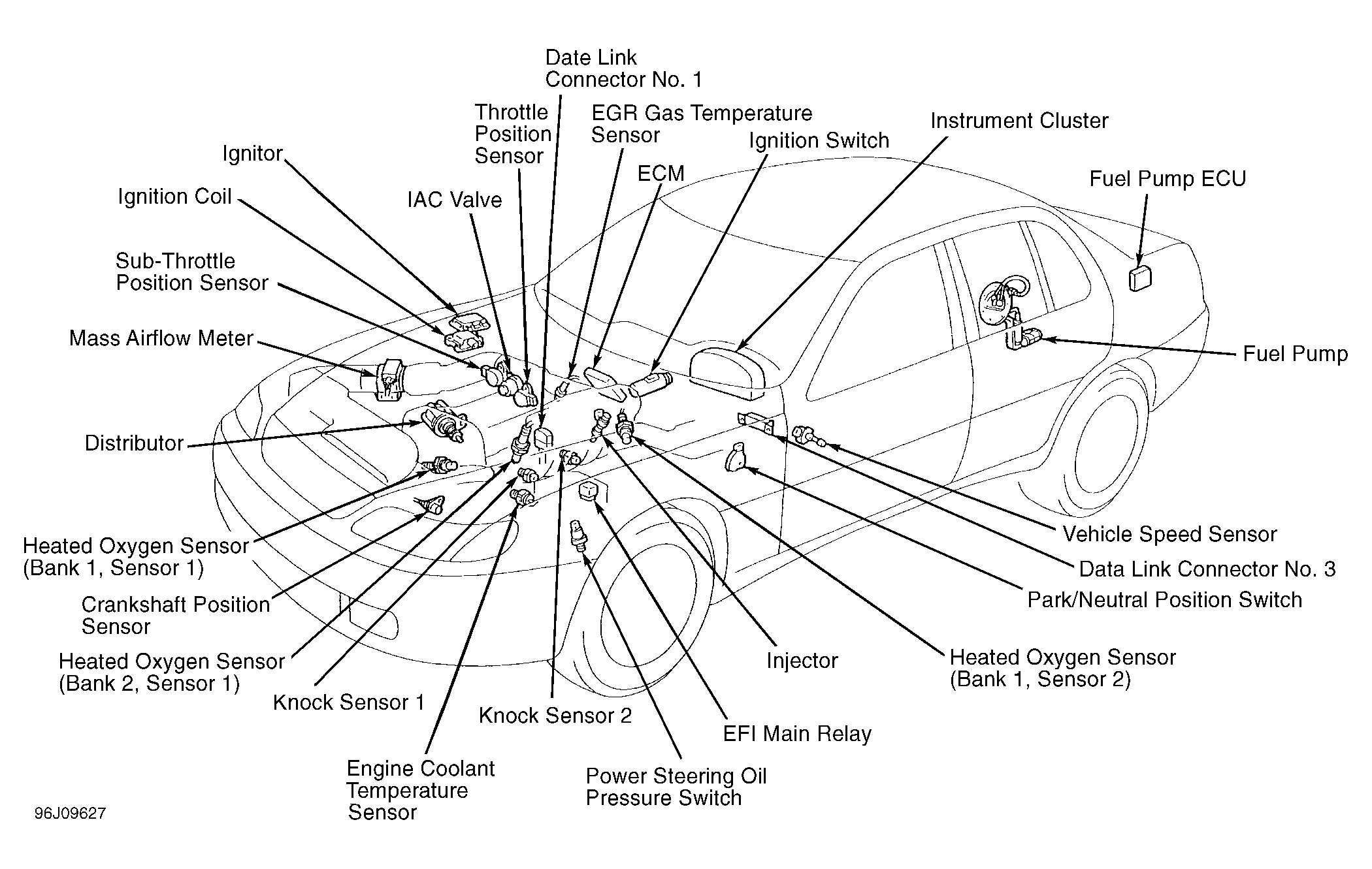 ECM controls engine operation based on input signals from various sensors. See Fig 1 ECM also controls transmission. If self-diagnostic system detects a fault, it stores a trouble code in the ECM memory, and turns on the Malfunction Indicator Light (MIL), also known as CHECK ENGINE light. For more information, see appropriate SELF-DIAGNOSTICS article.