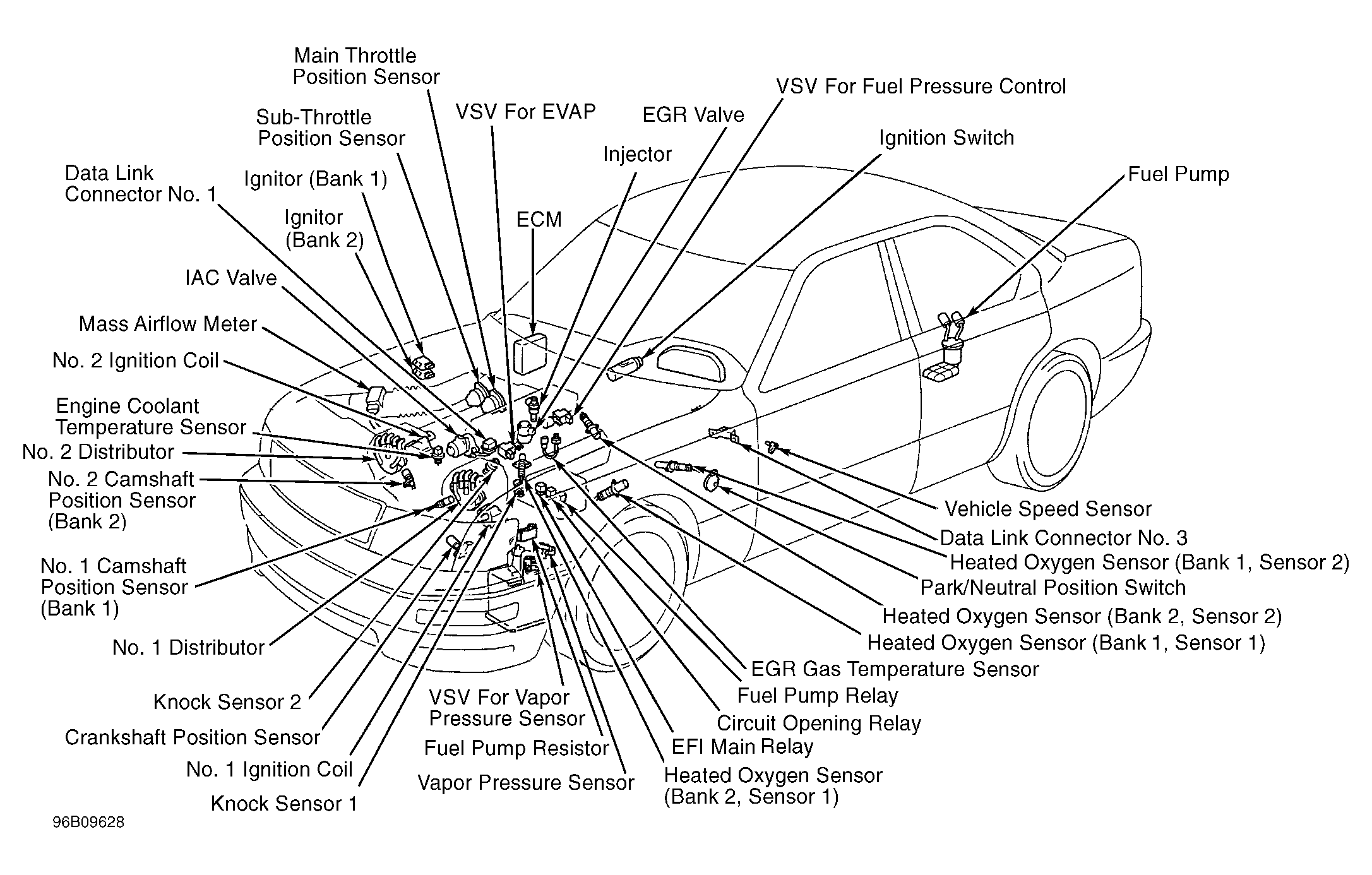 ECM controls engine operation based on input signals from various sensors. See Fig 1 ECM also controls transmission. If self-diagnostic system detects a fault, it stores a trouble code in the ECM memory, and turns on the Malfunction Indicator Light (MIL), also known as CHECK ENGINE light. For more information, see appropriate SELF-DIAGNOSTICS article.