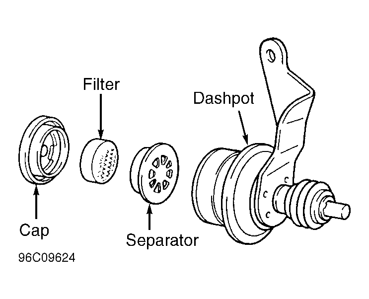 - Warm engine. Ensure idle speed is 650-750 RPM. Remove cap, filter and separator from end of dashpot. See Fig 1. Start engine and briefly raise engine speed to 4000 RPM. Use finger to cover hole inside area where separator is normally installed in dashpot. Release throttle valve. This will fully extend dashpot rod. Check engine speed (ensure cooling fan is not running).