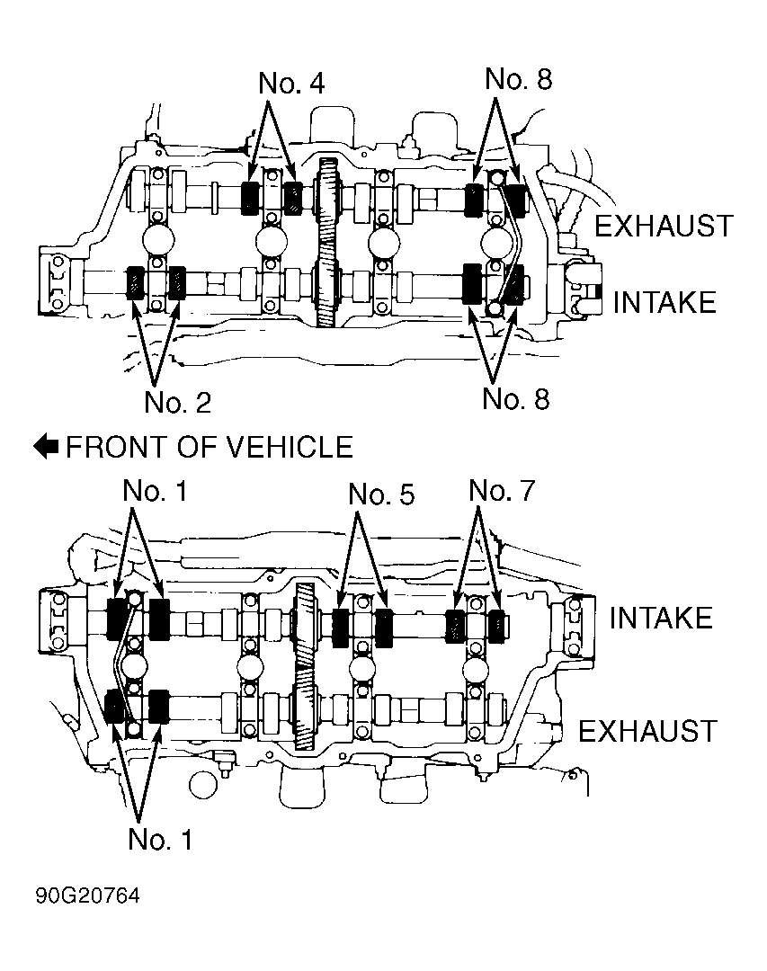 - Measure and record clearance of intake valves for cylinders No. 1, 2, 5, 7 and 8, and exhaust valves for cylinders No. 1, 4 and 8. See Fig 2 and Fig 3. Rotate crankshaft 360 degrees. Measure and record clearance of intake valves for cylinders No. 3, 4 and 6, and exhaust valves for cylinders No. 2, 3, 5, 6 and 7.