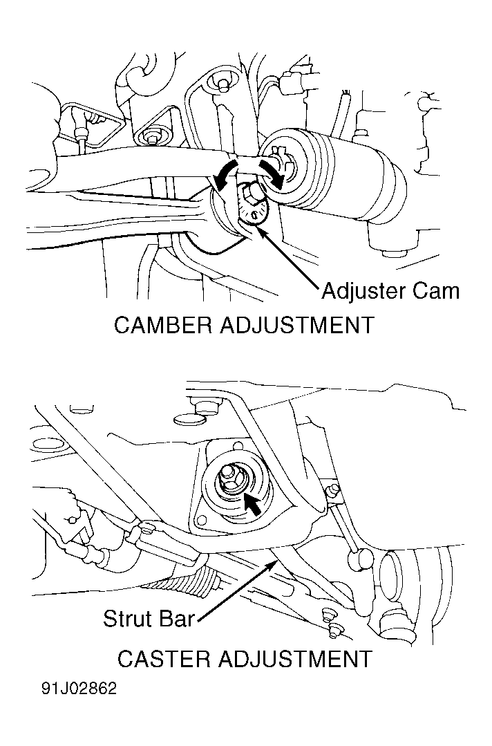 - Measure caster of each front wheel. If caster is not within specification, adjust angle by loosening strut bar nuts and changing length of strut bar(s). Caster changes by about 10 minutes for each rotation of nut. See Figure.