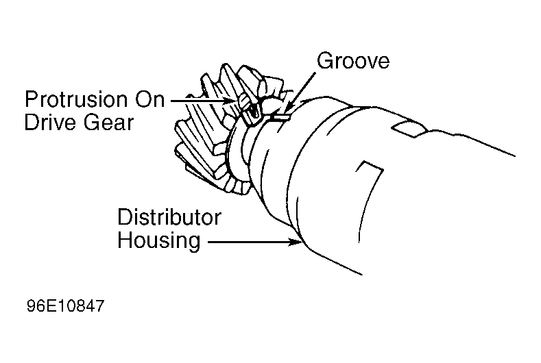 2. Install NEW "O" ring on distributor housing. Coat "O" ring with engine oil. Align protrusion on drive gear with groove on distributor housing. See Fig 3.