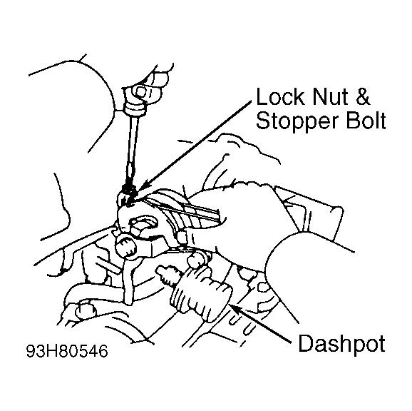 - Dashpot setting RPM should be 1900-2500 RPM. If dashpot setting RPM is not within specification, shut engine off. Loosen lock nut and rotate stopper bolt. See Fig 1.