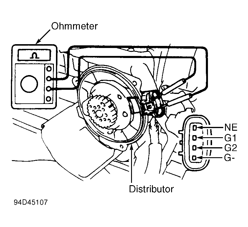 - If resistance is as specified, check resistance across terminals of the following distributor sensor.