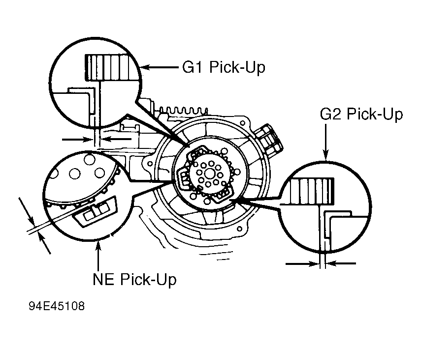- Measure air gap of pick-up coils G1, G2 and NE. See Fig 2. See DISTRIBUTOR PICK-UP COIL AIR GAP table. If air gap is within specification, go to next step. If air gap is not within specification, replace distributor.