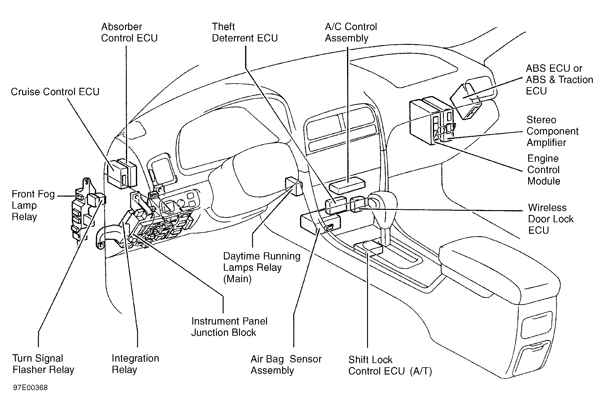 | Absorber Control ECU | Behind left side of dash. See Figure. |