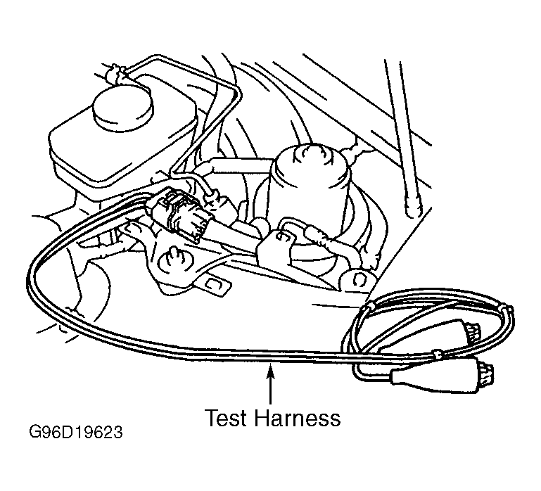 - Ensure master cylinder reservoir is full of brake fluid. Disconnect harness connector from pump. Connect auxiliary test harness to pump. See Fig 1. Remove battery cover and air cleaner inlet. Remove air cleaner assembly with hose.