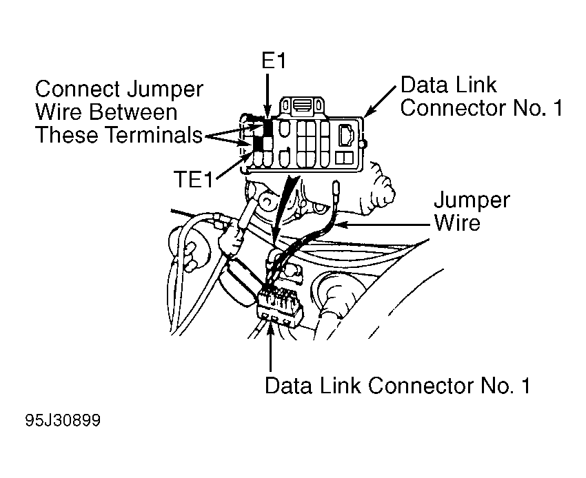- Install Jumper Wire (SST 09843-18020) between terminals TE1 and E1 on data link connector No. 1. See Fig 2. Data link connector No. 1 is located at passenger's side rear corner of engine compartment, near firewall.NOTE: Timing marks are located on front cover.