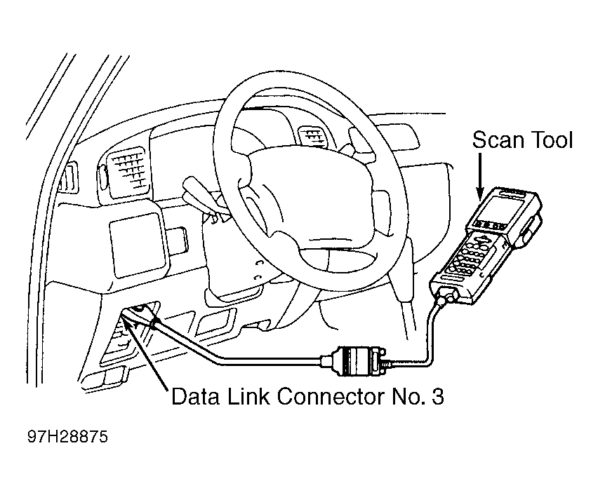 - Remove cover (if equipped) and connect scan tool to data link connector No. 3. See Fig 1. Turn ignition on. DO NOT start engine.
