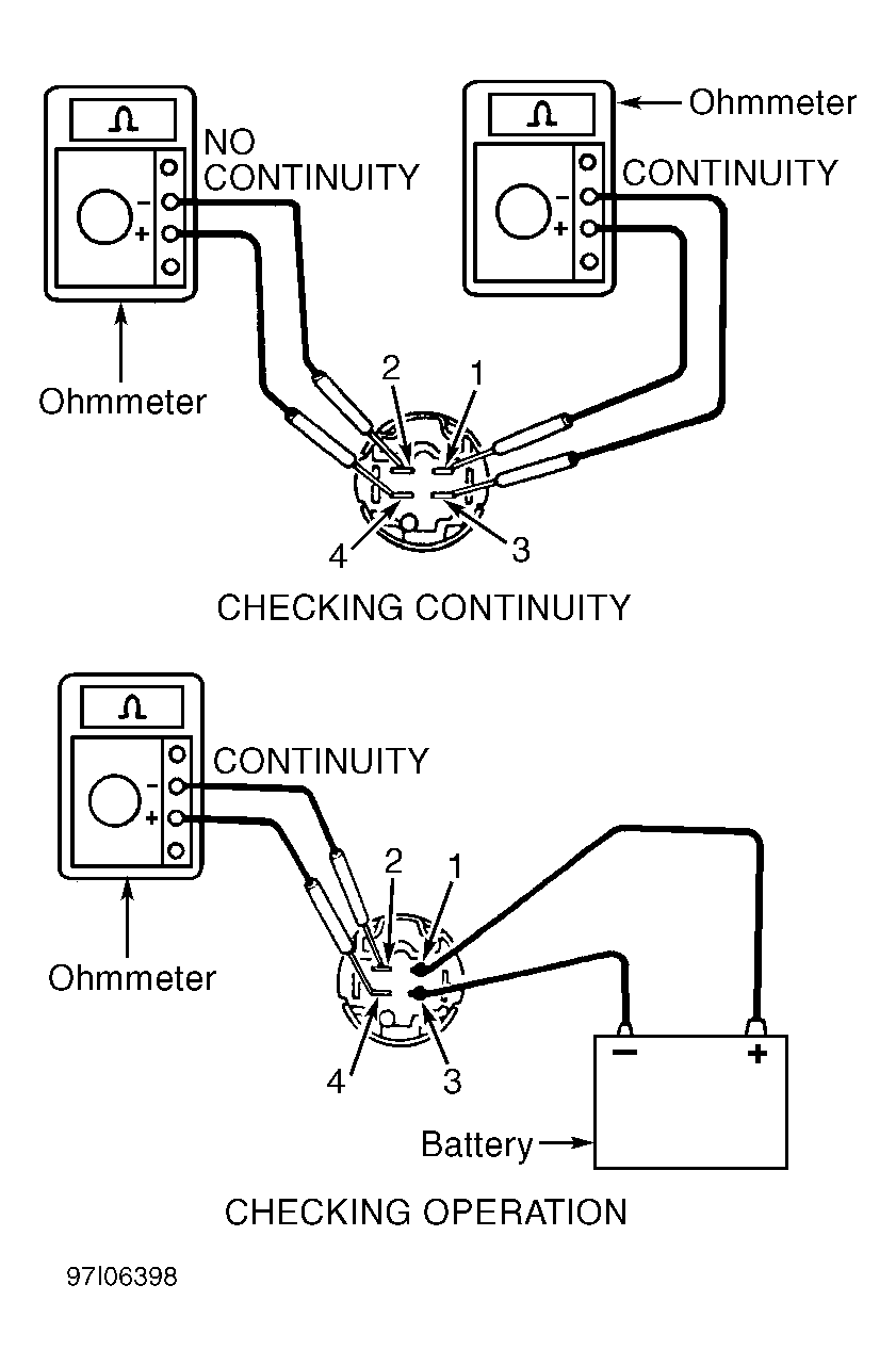 - To check circuit opening relay operation, apply battery voltage and ground to specified terminals on relay and use ohmmeter to check continuity between specified terminals. Perform STEP 2. See Fig 2. Replace circuit opening relay if defective.
