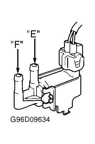 - Using jumper wires, apply battery voltage to VSV terminals. Apply air pressure to VSV port "E". Air should flow from port "F". Remove jumper wires from VSV terminals. No air should pass through port "F". Replace VSV as necessary.
