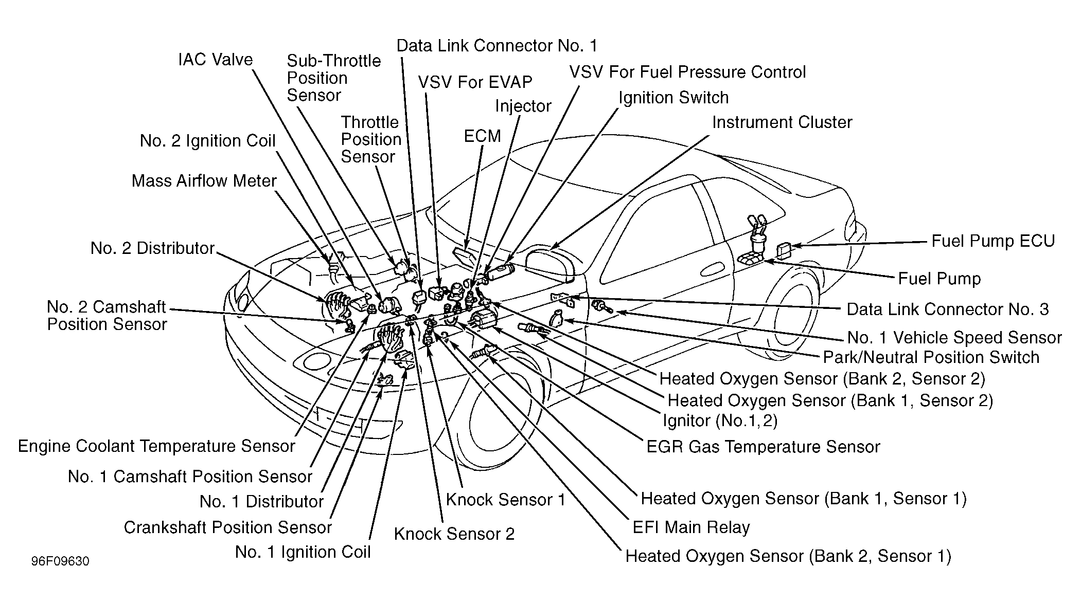ECM controls engine operation based on input signals from various sensors. See Fig 1. ECM also controls transmission. If self-diagnostic system detects a fault, it stores a trouble code in the ECM memory, and turns on the Malfunction Indicator Light (MIL), also known as CHECK ENGINE light. For more information, see appropriate TESTS W/CODES article.