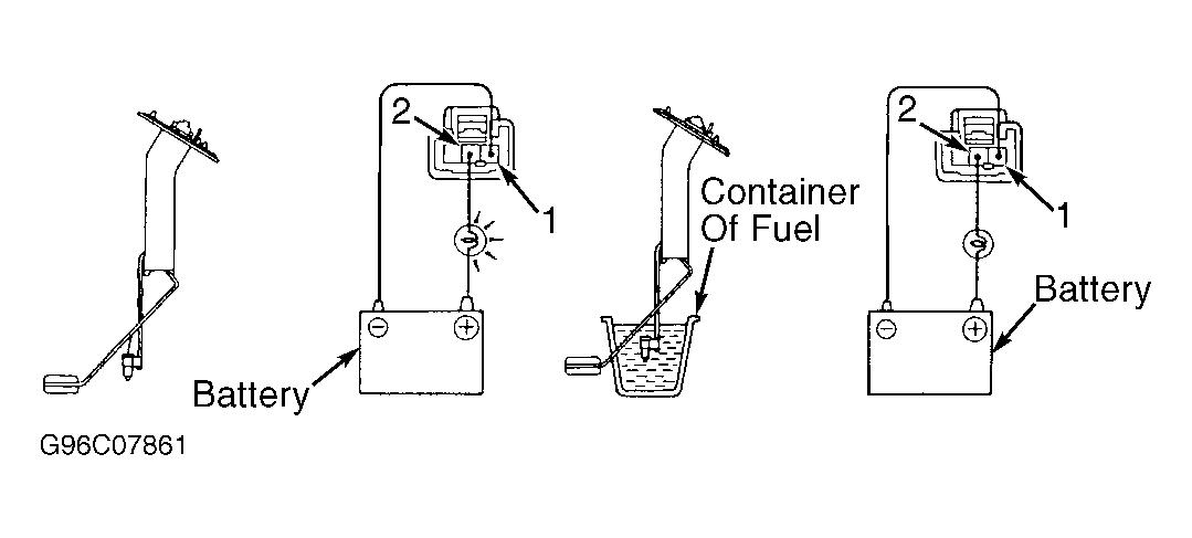 - Connect a 3.4-watt test light between battery positive terminal and sending unit connector. Test light should come on after a few moments. Submerge entire sending unit (or fuel level sensor portion) in a container of fuel. Test light should go out. If operation is not as specified, replace sending unit.