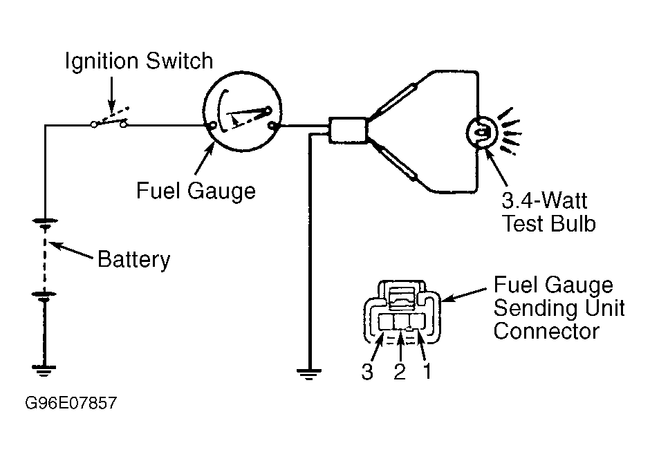 - Disconnect fuel gauge sending unit connector. Connect a jumper wire between terminals No. 1 and 3 at fuel gauge sending unit connector. For fuel gauge sending unit connector identification, see Figure.