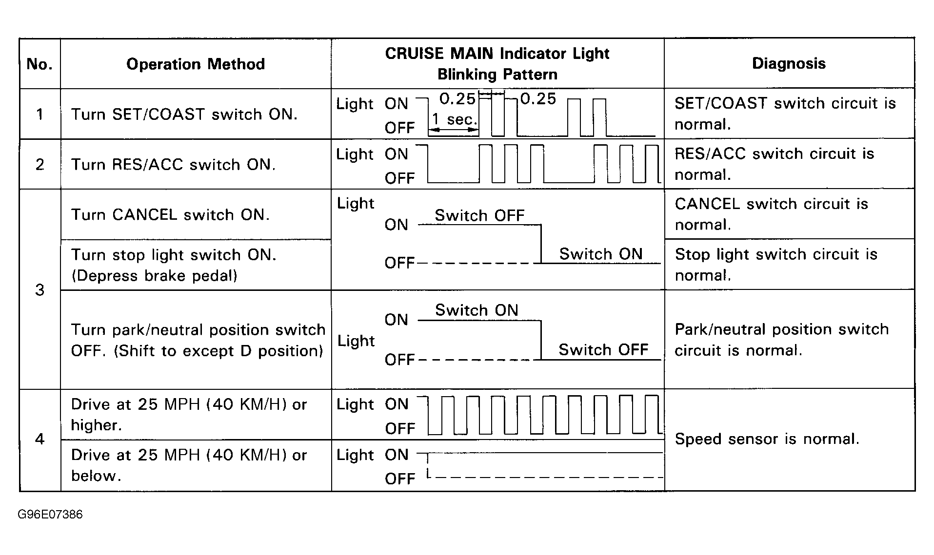 Use this procedure to determine whether cruise control ECU is receiving input signals from various switches and speed sensor. To perform procedure, enter diagnostic mode, then check if CRUISE indicator light responds as it should. See Figure.
