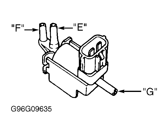 - Apply compressed air to port "E" of EGR VSV. Air should flow from port "G". Using fused jumper wires, apply battery voltage and ground to EGR VSV terminals. Again, apply compressed air to port "E". Air should flow from port "F". Replace EGR VSV as necessary.