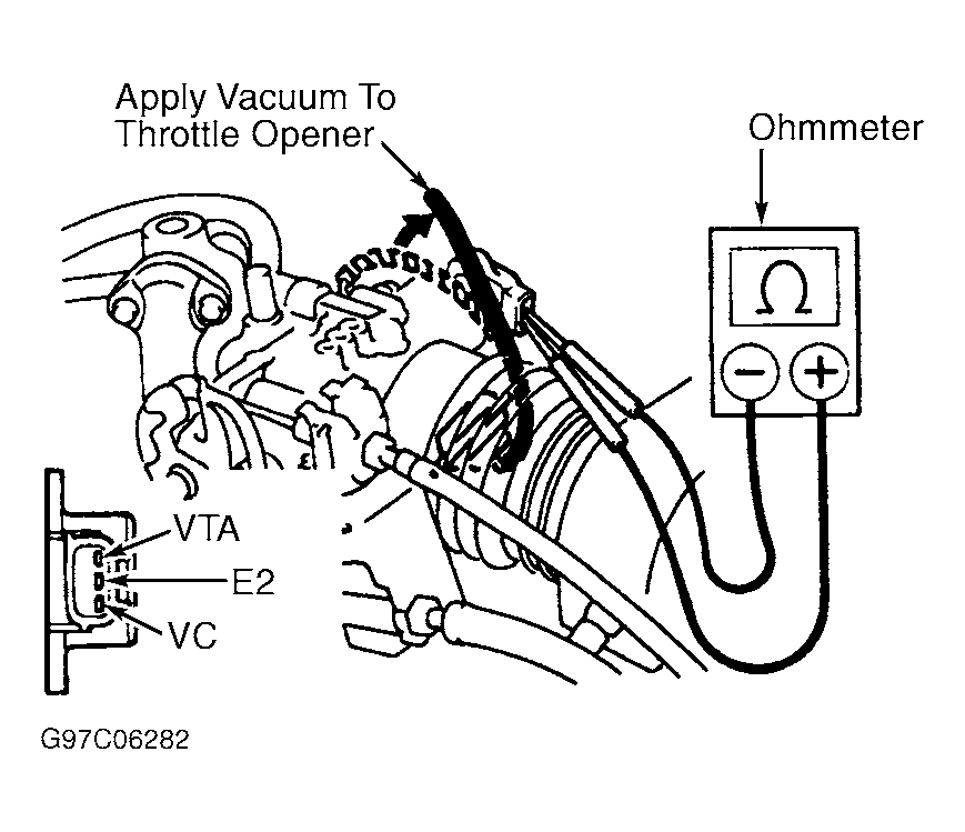 - Disconnect electrical connector from TP sensor. Note electrical terminals on TP sensor. See Fig 1. Apply vacuum to throttle opener.