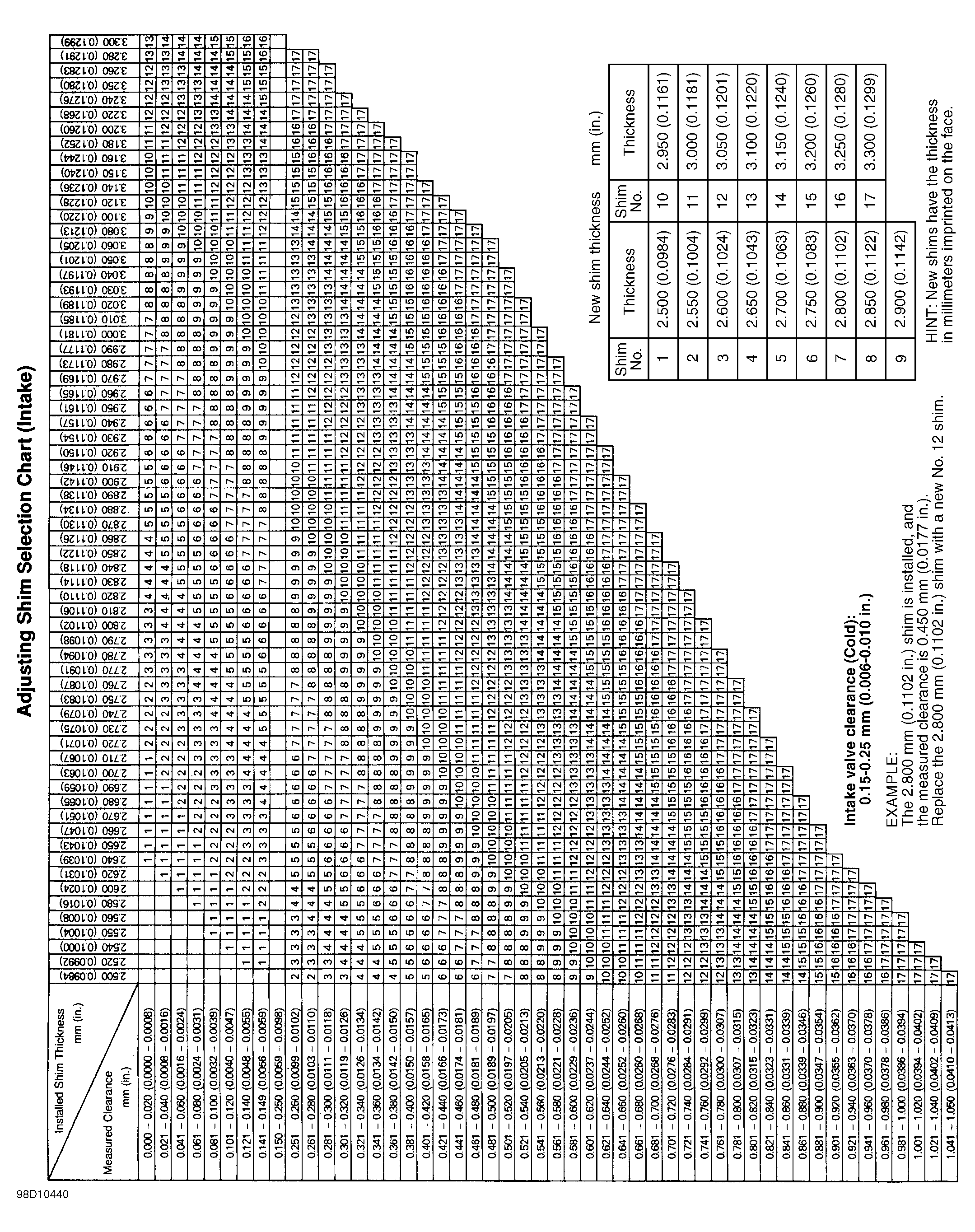 Subtract.012" (.30 mm) from the measured (actual) valve clearance. Add the result to the thickness of the used shim. The final result represents the thickness of the new shim.