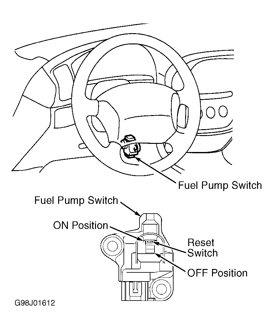 Fuel pump switch is in the circuit between FPC terminal on ECU and FPC terminal on fuel pump ECU. Fuel pump switch may also be referred to as fuel pump inertia switch or fuel pump control switch. If vehicle is involved in a collision, fuel pump switch will shut off the fuel pump by opening this circuit, and not allowing any input signal to be delivered from ECM to fuel pump ECU. Fuel pump switch is located on driver's side of instrument panel. See Fig 2. Fuel pump switch contains a reset switch which has an OFF and ON position. See Fig 2. Continuity will exist between electrical terminals on fuel pump switch with reset switch in the ON position, and no continuity in the OFF position. Reset switch must be in ON position for fuel pump operation.