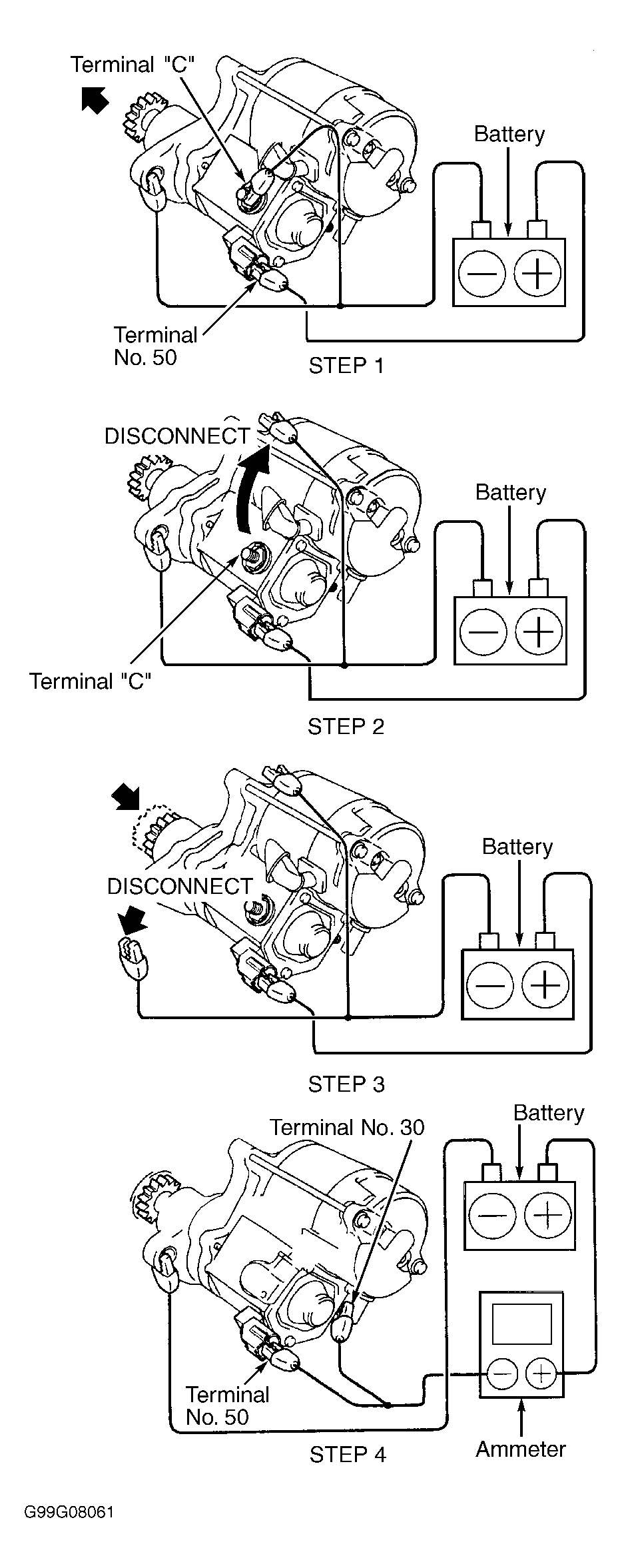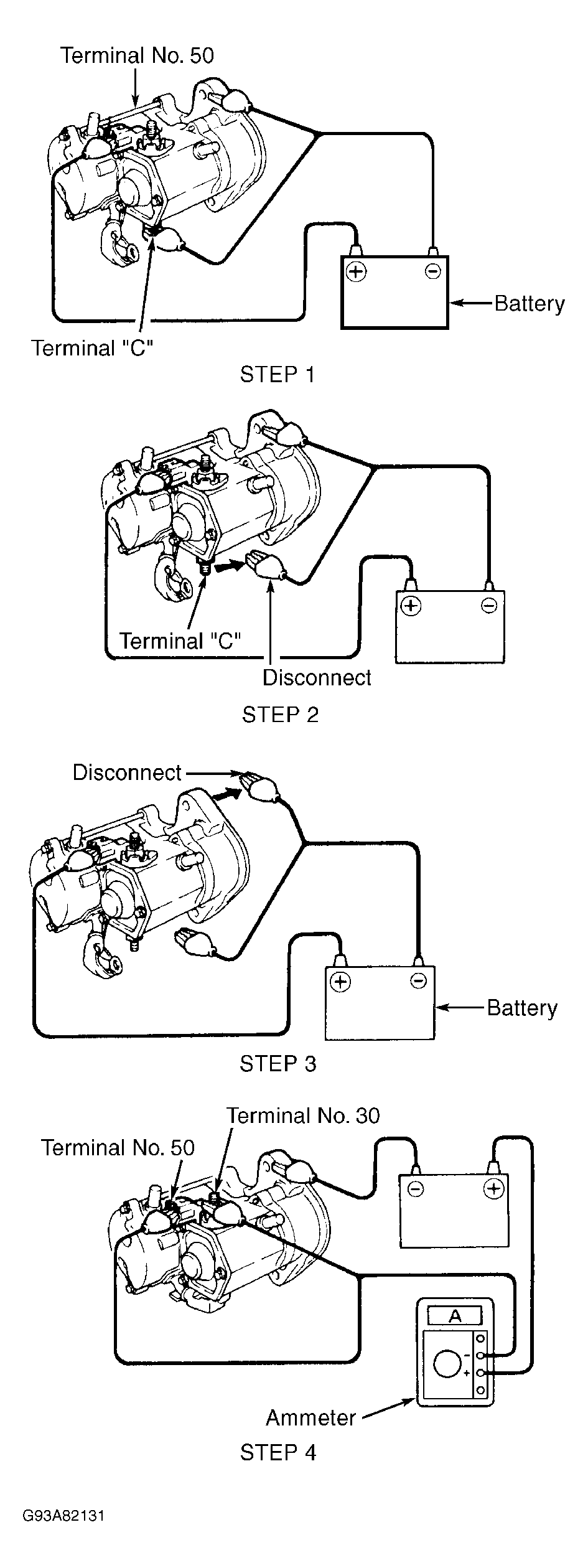 Connect battery and ammeter to starter. See Figure or Figure . Perform STEP 4. Starter armature should rotate smoothly and steadily with pinion gear moving out. Amperage draw should be within specification. See NO-LOAD TEST SPECIFICATIONS  table.