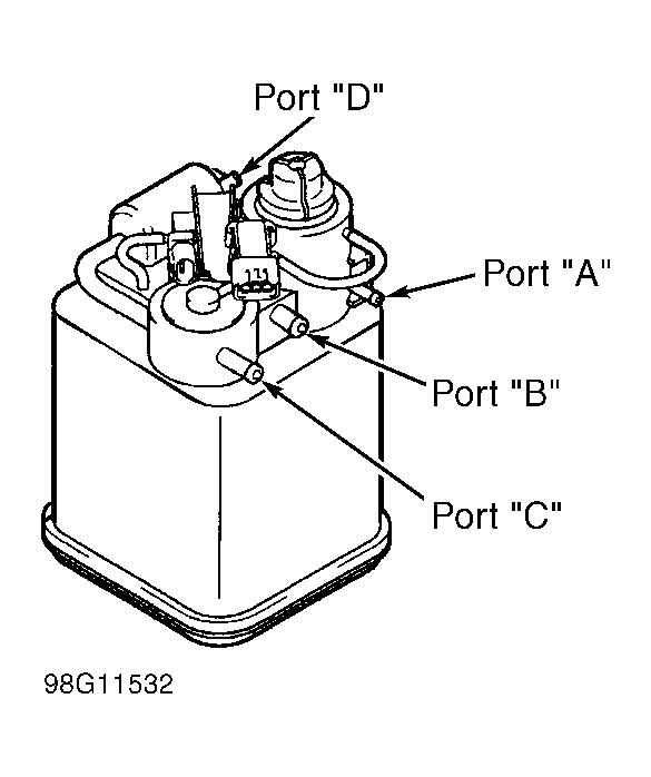 - To check charcoal canister, hold port "B" closed and apply .26 psi of compressed air to port "A" on top of canister. See Fig 3. Air should flow from port "D". Plug port "B" and "D" and apply .26 psi of compressed air to port "A". Air should not flow from port "C".