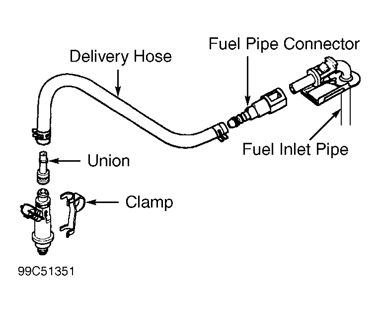 - Disconnect fuel injector tester. Ensure fuel leakage from end of fuel injector does not exceed one drop per minute. Replace fuel injector if leakage exceeds specification. Disconnect negative battery cable. Remove test equipment. Apply light coat of engine oil on tip of fuel inlet pipe to allow for ease of disconnect fitting and No. 1 fuel pipe installation.CAUTION: DO NOT reuse old retainer when installing No. 1 fuel pipe on fuel inlet pipe. Always use a NEW retainer.