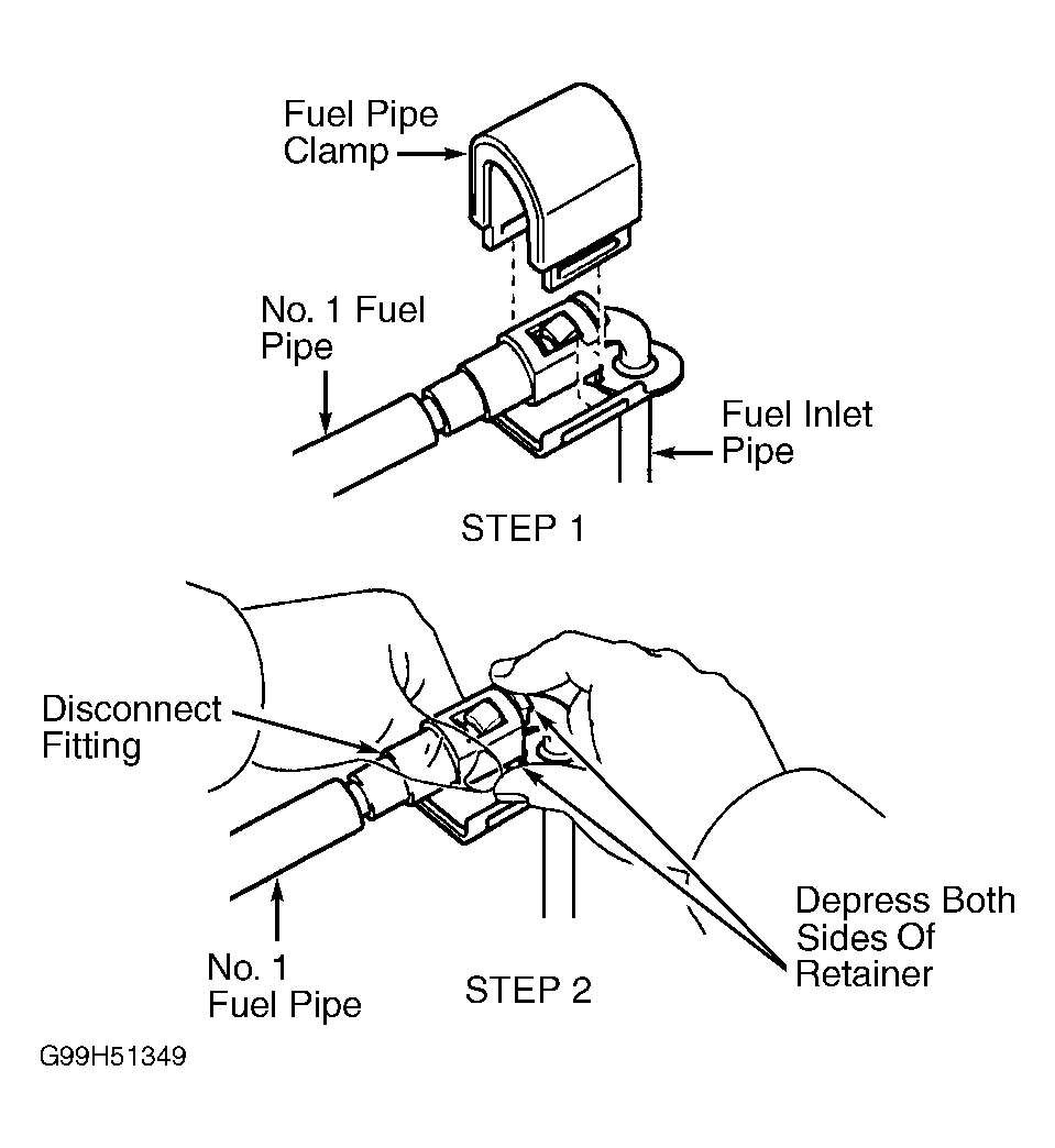 - Remove fuel injector. See FUEL SYSTEM in REMOVAL, OVERHAUL & INSTALLATION article. Fuel injector is connected to fuel inlet pipe for checking fuel injector volume. Remove fuel pipe clamp from No. 1 fuel pipe at fuel inlet pipe. Perform STEP 1. See Fig 1. Ensure area around No. 1 fuel pipe and fuel inlet pipe is clean. Depress both sides of retainer and pull No. 1 fuel pipe with disconnect fitting from fuel inlet pipe. Perform STEP 2. See Fig 1.