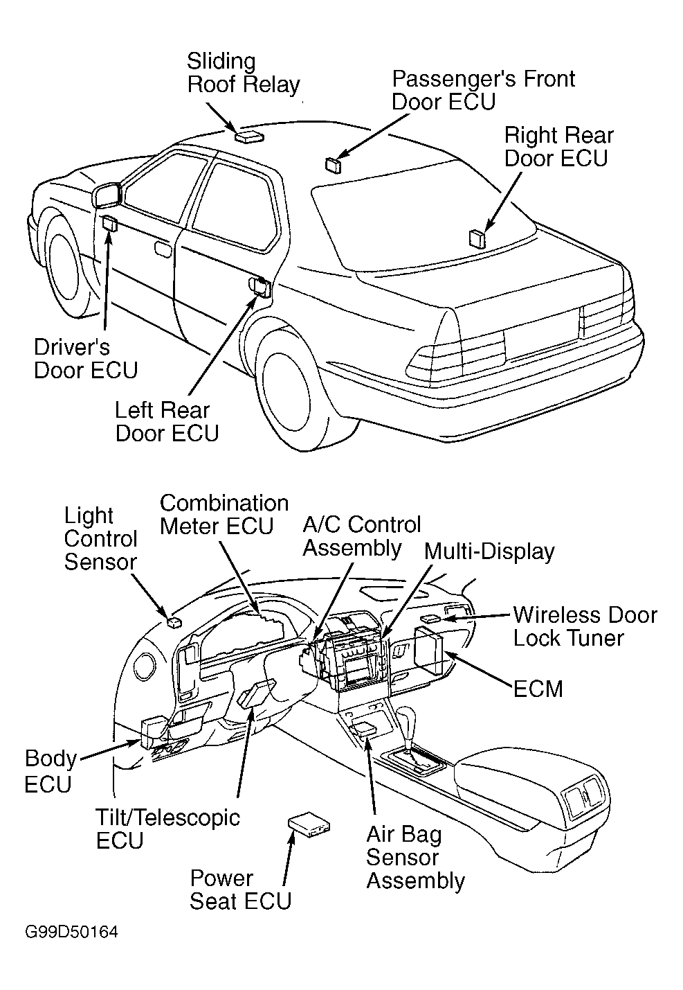 The multiplex control system consists of a body Electronic Control Unit (ECU) connected to 2 communication buses. The door system communication bus includes driver's door ECU, passenger's front door ECU, left rear door ECU, right rear door ECU, memory power seat ECU (if equipped), sliding roof control relay (if equipped), and tilt and telescopic ECU. The instrument panel system communication bus includes combination meter ECU, A/C control assembly, multi-display (if equipped) and Engine Control Module (ECM). See Fig 1. Both buses are connected to body ECU through their own bus cut-relay. The multiplex control system is also equipped with a self-diagnostic function. Some electrical systems are directly connected to the body ECU, while some electrical loads and switches are connected to the appropriate system ECU.