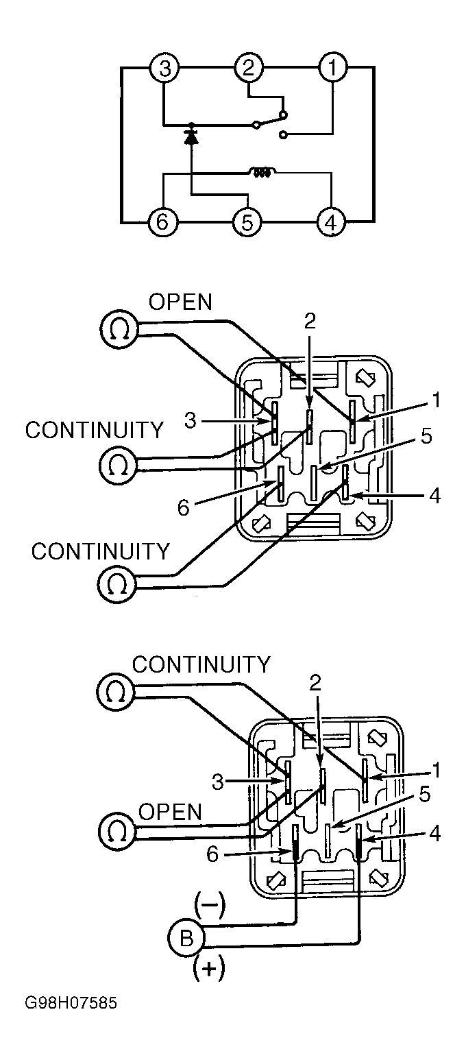 - Using jumper wires, connect positive battery voltage to ABS solenoid relay terminal No. 4 and negative battery voltage to terminal No. 6. Check continuity between relay terminals No. 2 and 3. Continuity should not exist. Check continuity between relay terminals No. 1 and 3. Continuity should exist. Replace relay if any preceding tests are not as specified. If relay tests are as specified, go to next step.