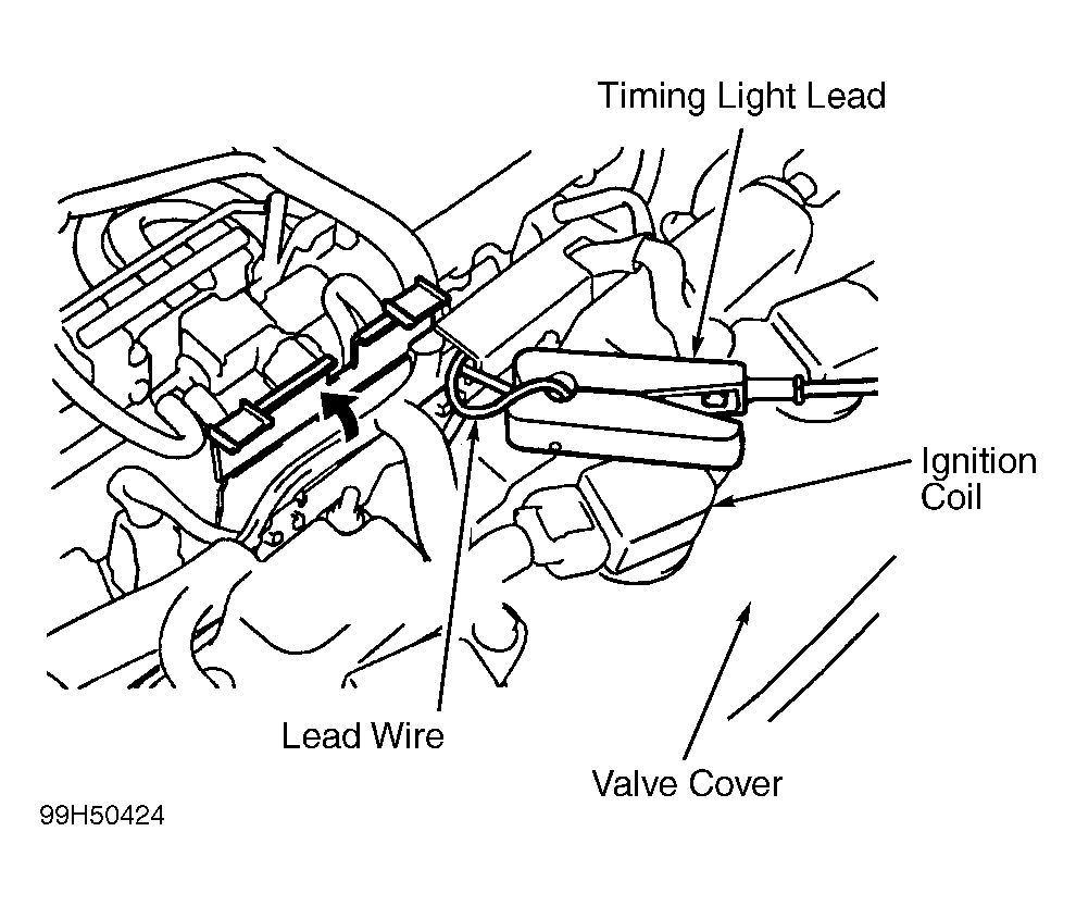 2. Connect timing light lead to lead wire located near ignition on top of front valve cover. See Fig 2. Apply parking brake. Place transaxle in Neutral. Start engine and maintain engine at 2500 RPM for 90 seconds and then allow engine to idle. Ensure idle speed is 650-750 RPM.