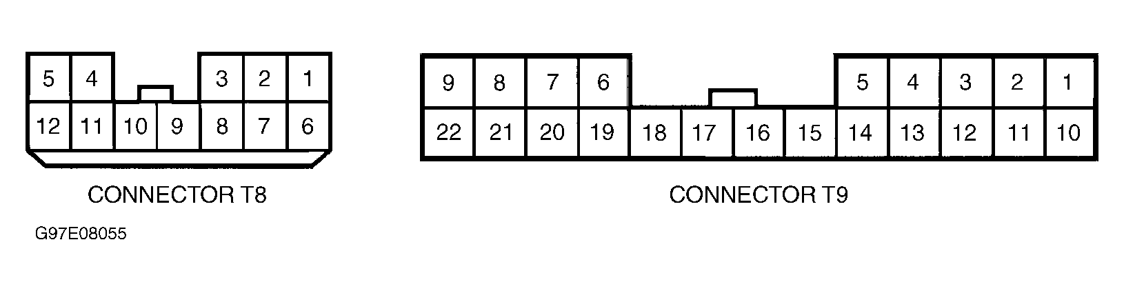 - Turn ignition on. Remove tilt and telescopic ECU from its mounting, leaving wiring harness connector attached. Measure voltage by backprobing rear of terminal No. 12 (Black/Blue wire) with voltmeter positive lead and by backprobing rear of terminal No. 4 (White wire) with negative lead at 22-pin ECU harness connector T9. See Figure. Measure voltage by backprobing rear of terminal No. 13 (White/Red wire) with voltmeter positive lead and by backprobing rear of terminal No. 5 (White/Blue wire) with negative lead at 22-pin ECU harness connector T9. If voltage is not 4.5-5.5 volts for both measurements, go to step 3. If voltage is 4.5-5.5 volts for both measurements, go to next step.