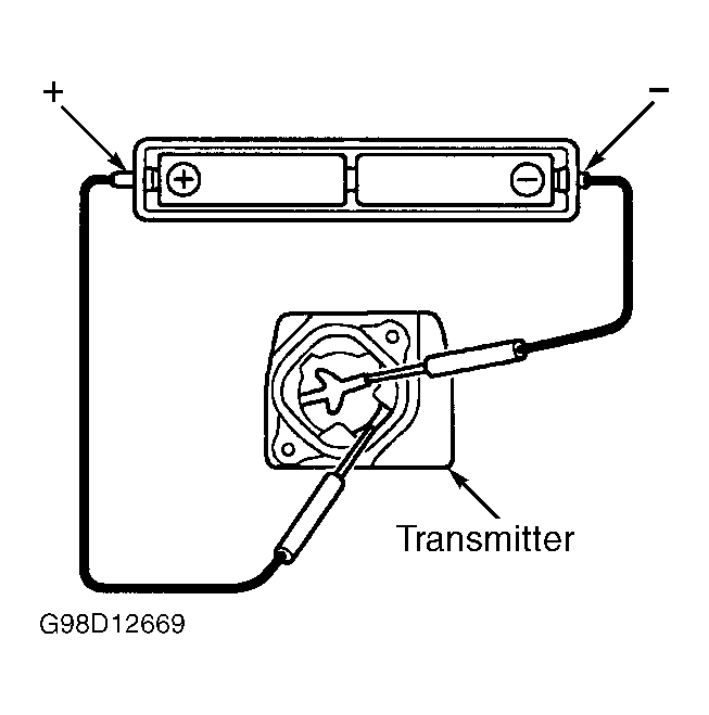 Open transmitter and remove battery. Connect 2 new 1.5-volt dry-cell batteries in series. See Fig 1. Connect battery positive terminal to battery receptacle side terminal and battery negative terminal to bottom terminal to provide 3 volts to transmitter. Attempt to operate door lock by remote control. If door locks operate, replace battery. If door locks do not operate, replace transmitter and reprogram. See PROGRAMMING .
