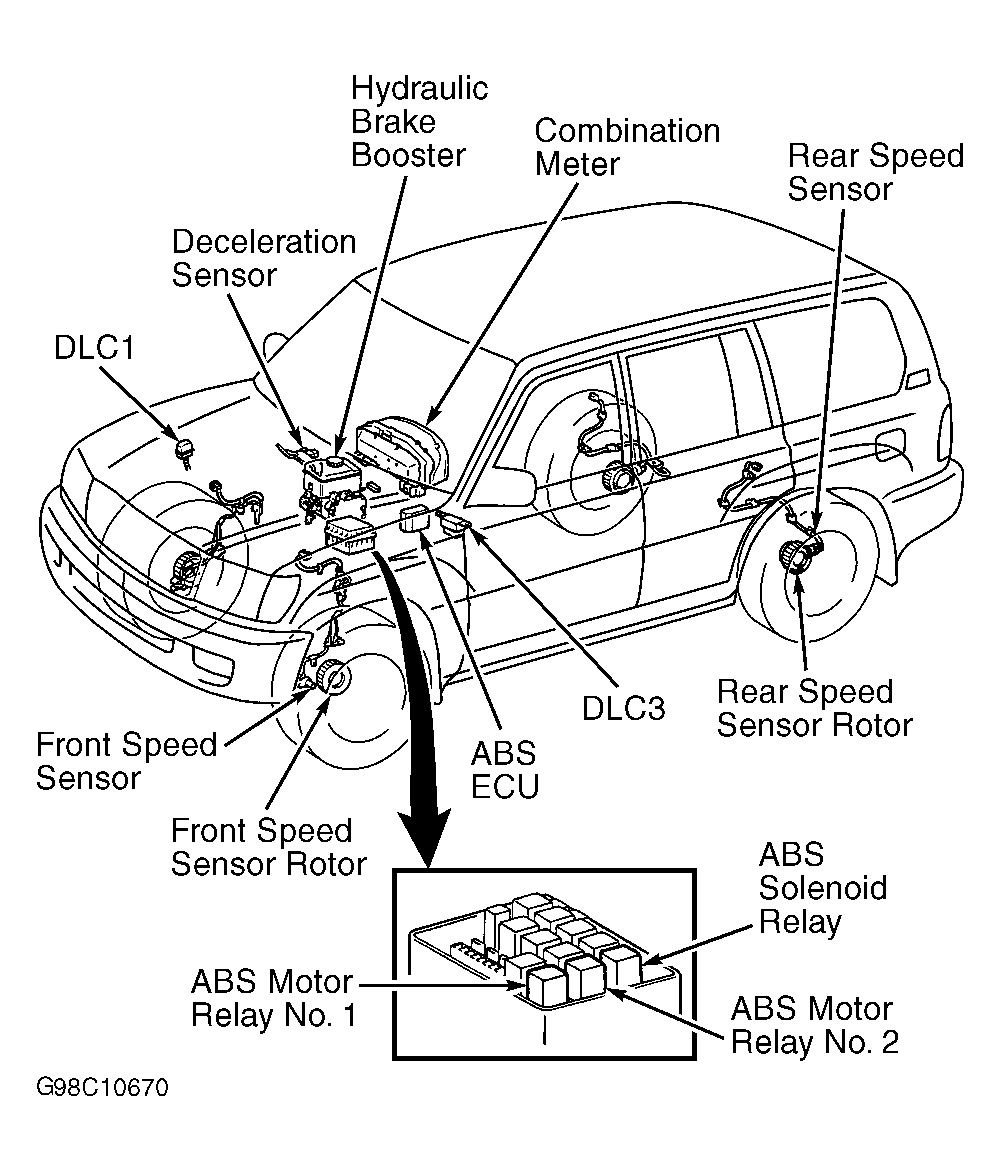The Anti-Lock Brake System (ABS) consists of an ABS Electronic Control Unit (ECU), hydraulic brake booster (master cylinder and actuator combination), 4 wheel-speed sensors, deceleration sensor and stoplight switch. See Fig 1.
