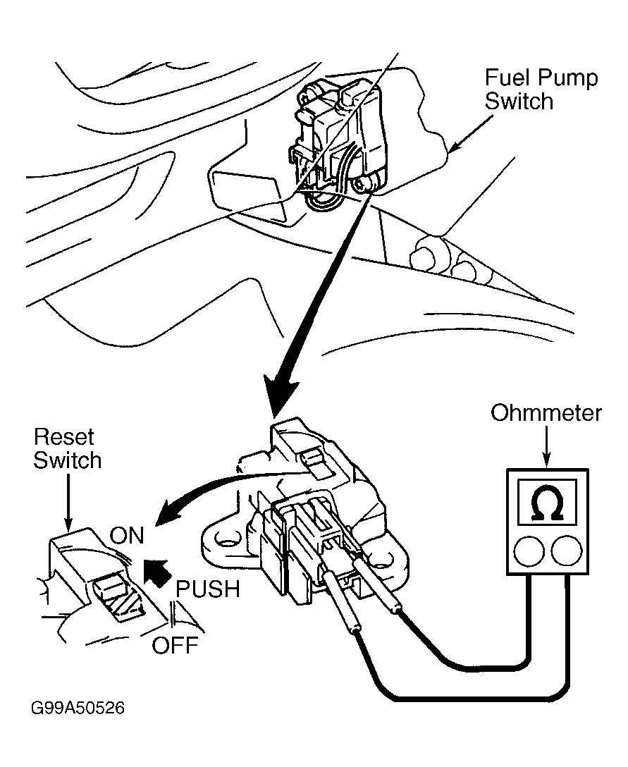 - Using ohmmeter, check that no continuity exists between electrical terminals on fuel pump switch with reset switch in OFF position. Check that continuity exists between electrical terminals on fuel pump switch with reset switch in ON position. Replace fuel pump switch if defective. Ensure reset switch is in the ON position for fuel pump operation.