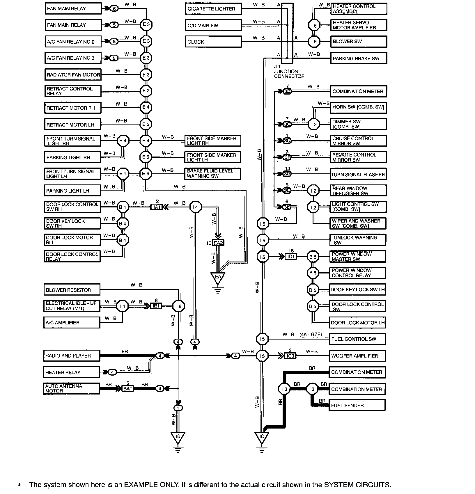 The ground points circuit diagram shows the connections from all major parts to the respective ground points. When troubleshooting a faulty ground point, checking the system circuits which use a common ground may help you identify the problem ground quickly. The relationship between ground points (EA, IB and IC shown) can also be checked this way.