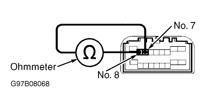 - Turn ignition off. Disconnect 18-pin tilt and power telescopic unit (combination switch) harness connector. Measure resistance between terminal No. 7 (Violet/White wire) and terminal No. 8 (Brown wire) at tilt and power telescopic unit (combination switch) harness connector. See Fig 1. With auto set switch in on position, if resistance is one megohm or more, go to next step. With auto set switch off, if continuity does not exist between terminals, replace tilt and power telescopic unit (combination switch) and retest system operation.