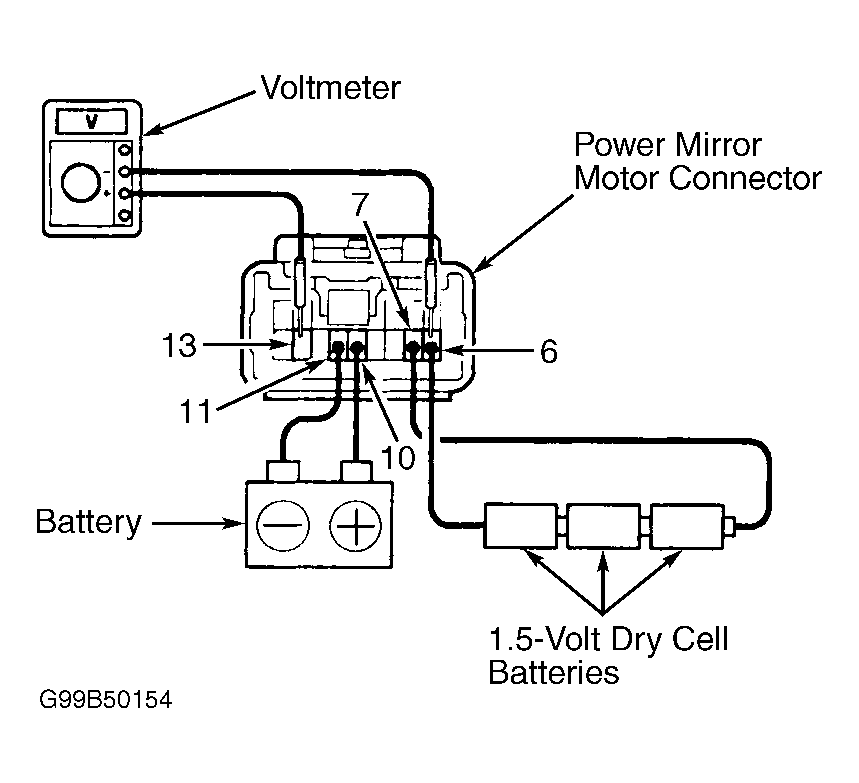 - Disconnect power mirror motor harness connector. Connect three 1.5-volt dry cell batteries together in series. See Fig 1. Connect dry cell battery positive lead to terminal No. 7 and negative lead to terminal No. 6. Connect positive lead of voltmeter to terminal No. 13 and negative lead to terminal No. 6.