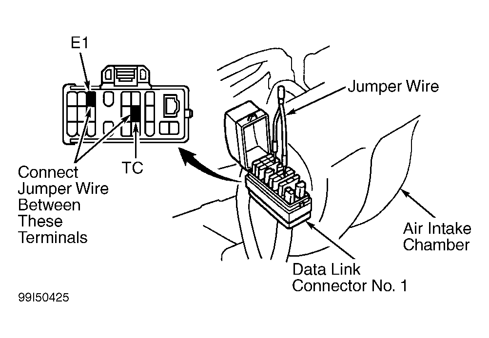 - Install Jumper Wire (SST 09843-18020) between terminals TC and E1 on data link connector No. 1. On GS300, data link connector No. 1 is located near driver's side strut tower. See Fig 4. On SC300, data link connector No. 1 is located on end of air intake chamber. See Fig 5.