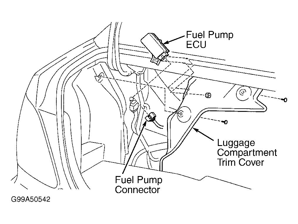 Fuel pump ECU is located on left side of luggage compartment. See Fig 1. Remove luggage compartment trim cover. Disconnect electrical connector at fuel pump ECU. Remove bolt and fuel pump ECU. To install, reverse removal procedure.