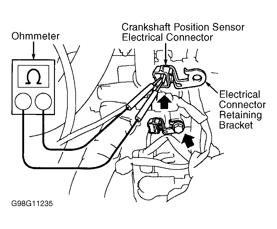 2. Using ohmmeter, check resistance between electrical terminals on crankshaft position sensor electrical connector. Ensure crankshaft position sensor resistance is within specification. See CRANKSHAFT POSITION SENSOR RESISTANCE  table. Replace crankshaft position sensor if resistance is not within specification. See IGNITION SYSTEM in REMOVAL, OVERHAUL & INSTALLATION article. Reinstall electrical connector.
