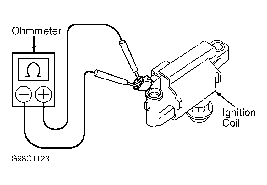 Using ohmmeter, check ignition coil secondary resistance between electrical terminal and spark plug terminal on ignition coil. See Fig 2. Replace ignition coil if ignition coil secondary resistance is not within specification. See IGNITION COIL RESISTANCE (OHMS) table. Reinstall ignition coil.IGNITION COIL RESISTANCE (OHMS)