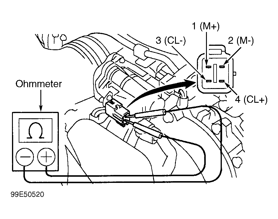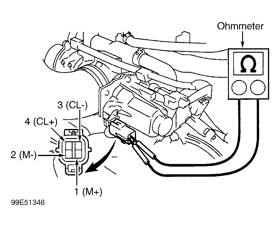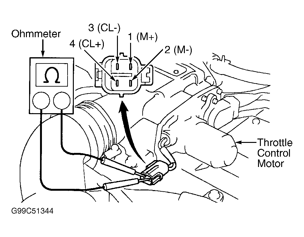 - Measure resistance between terminals No. 1 (M+) and 4 (M-) at throttle control motor connector. See Fig 1, Fig 2 or Fig 3